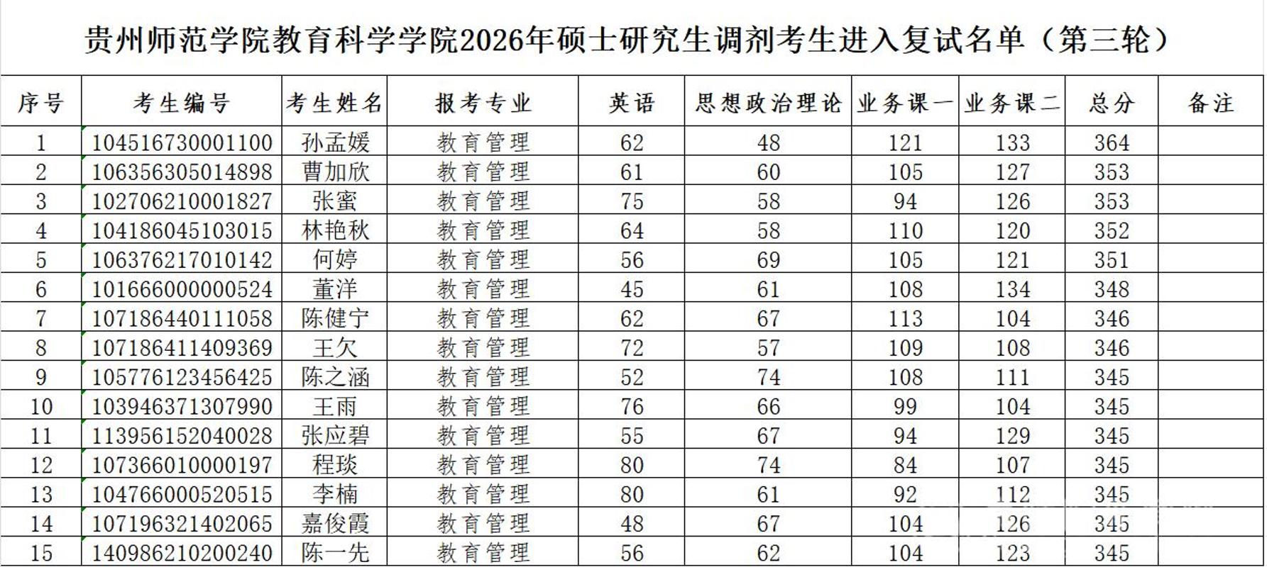贵州师范学院教育科学学院2026年硕士研究生调剂考生进入复试名单(三)