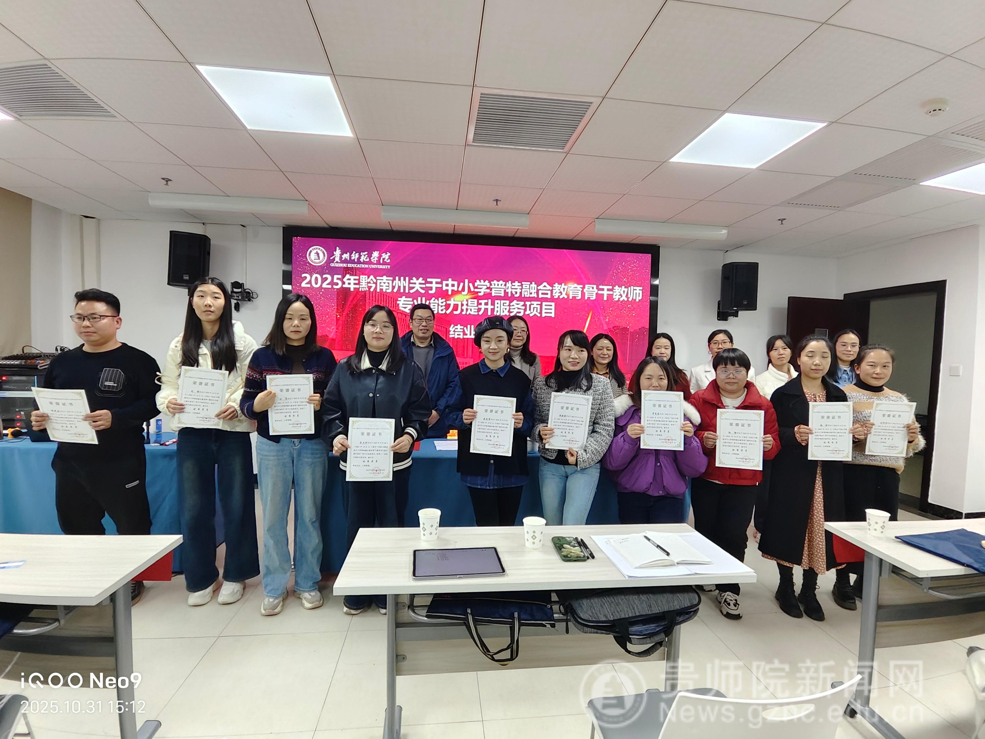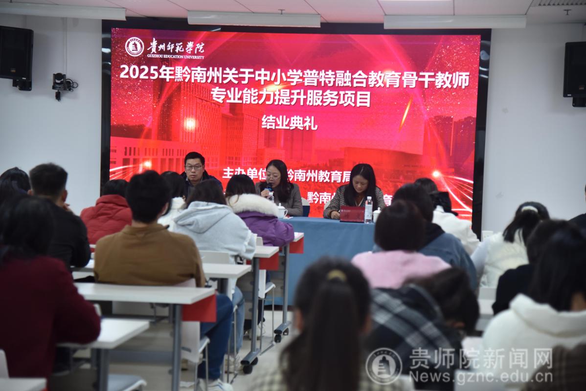 2025年10月31日下午3时,黔南州中小学普特融合教育骨干教师专业能力提升服务项目结业典礼在贵州师范学院综合楼实训楼15-2举行。此次活动旨在总结项目成果,表彰优秀学员,并进一步推动普特融合教育高质量发展。贵州师范学院教育科学学院党委书记肖湘萍、特殊教育系主任雷经国及全体参训教师出席典礼,典礼由特殊教育系教师杨曼主持。