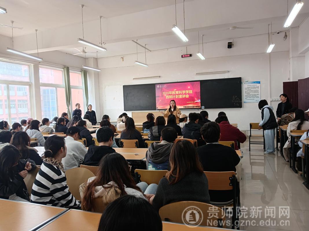 为引导广大毕业生投身西部建设,在祖国最需要的地方绽放青春,2026年3月17日下午,教育科学学院在逸夫楼503举办2026年大学生志愿服务西部计划宣讲会。本次宣讲会由李琴老师主持,学院团委书记张源担任主讲,2022级全体大四学生通过线上线下相结合的方式参与会议。