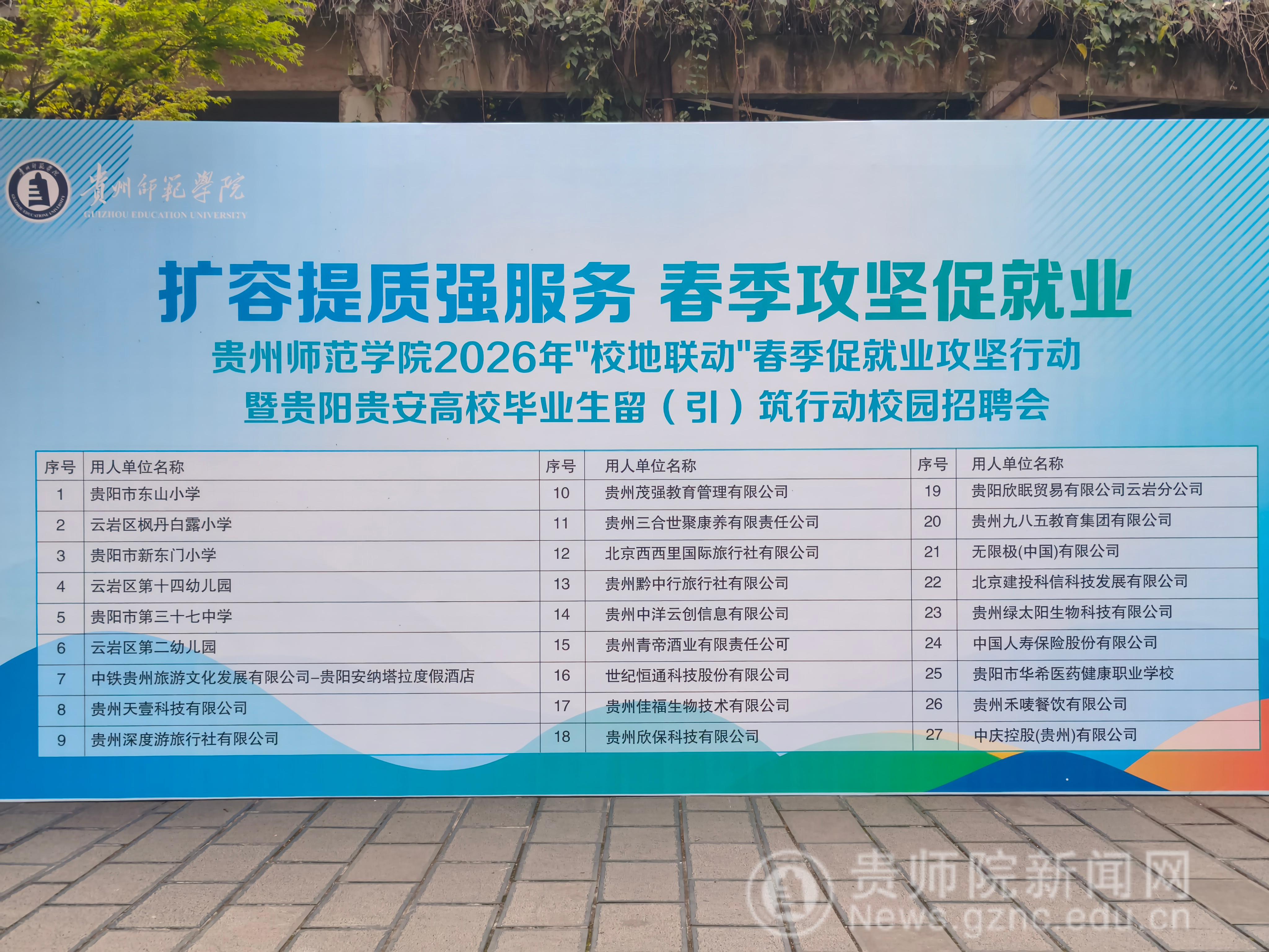 为深入贯彻落实党中央、国务院和省委、省政府 “稳就业”“保就业”决策部署,抢抓春季就业工作关键期,全力促进2026届毕业生高质量充分就业,搭建高校毕业生与用人单位精准对接的优质服务平台,3月19日下午,由贵州师范学院、云岩区人力资源和社会保障局联合主办,贵州师范学院教育科学学院、生物科学学院、化学与材料学院及云岩区人才服务中心共同承办的2026年“校地联动”春季促就业攻坚行动暨贵阳贵安高校毕业生留(引)筑行动校园招聘会贵州师范学院专场,在学校逸夫楼凤凰广场成功举行。