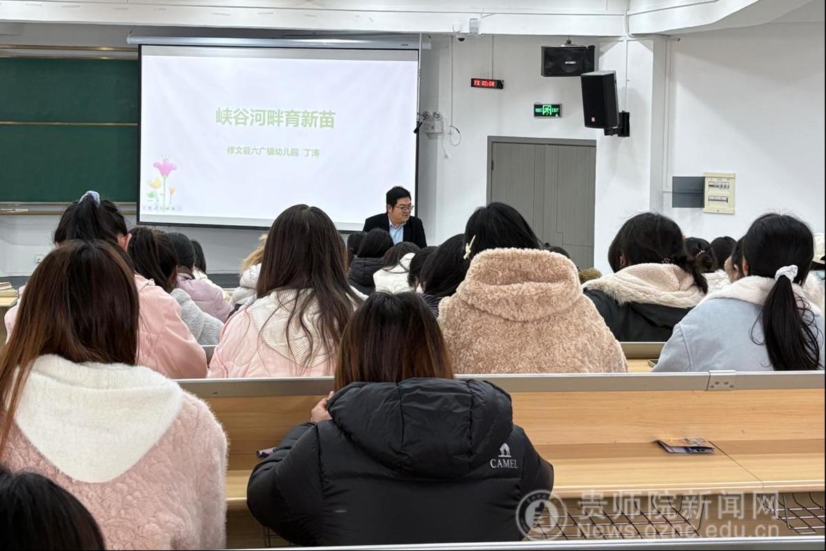 3月20日,贵州师范学院教育科学学院邀请贵州省乡村名师、修文县县管专家、修文县六广镇中心幼儿园园长、学前教育专业2013届毕业生丁涛为2022级、2023级学前教育专业大学生开展名为《青春逐梦·不负韶华》的讲座,围绕五方面内容分享经验。此次讲座是学前教育专业2023级实习前培训活动之一,活动在宁静楼535教室开展,2022级、2023级同学参与聆听。