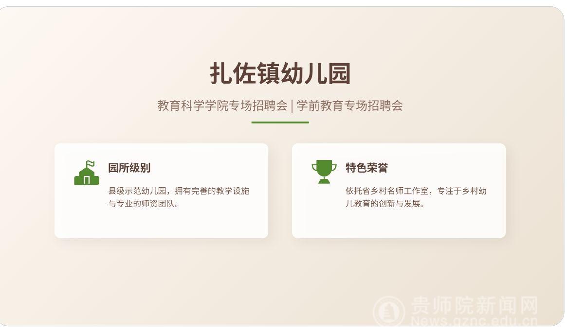 丁涛作为教育科学学院优秀校友,以亲切的身份与毕业生展开交流,首先介绍了修文县扎佐镇幼儿园的办园理念与地理人文优势。园所秉持“童心至真,生命至广”的办园理念,倡导教师坚守教育童心与初心,用心呵护幼儿成长;园所位于六广镇,毗邻毕节黔西,坐拥六广大峡谷等秀丽自然景观,兼具奢香夫人九驿文化底蕴,不仅是幼儿成长的乐园,更是教师修养身心、潜心育人的好地方。