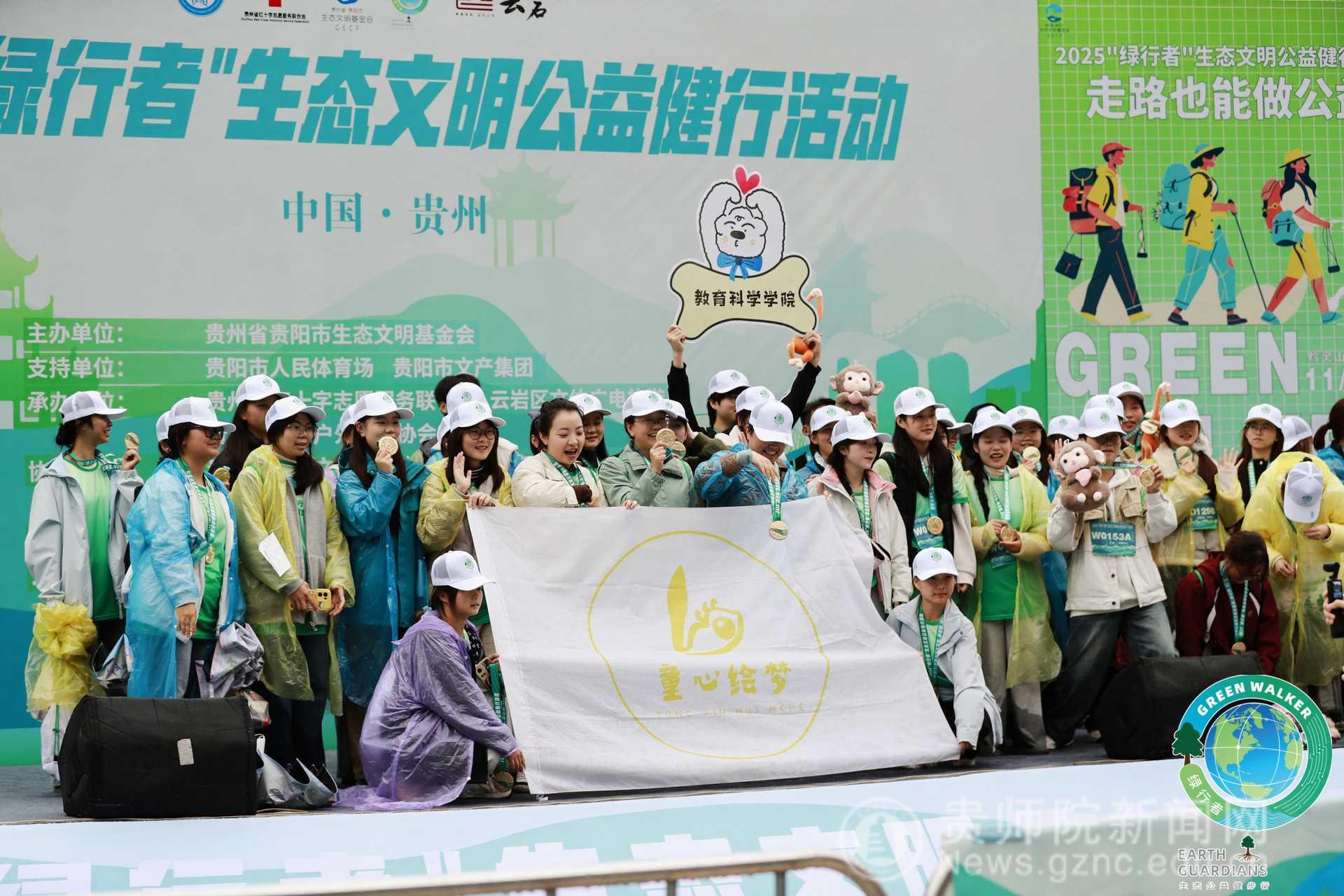 2025年11月9日上午,教育科学学院童心绘梦艺术公益社团成员代表在学院党委书记肖湘萍、指导教师张源、主懿芹、吴俊华等的带领下,齐聚黔灵山公园南门,共同参与“2025年‘绿行者’生态文明公益健行活动”。